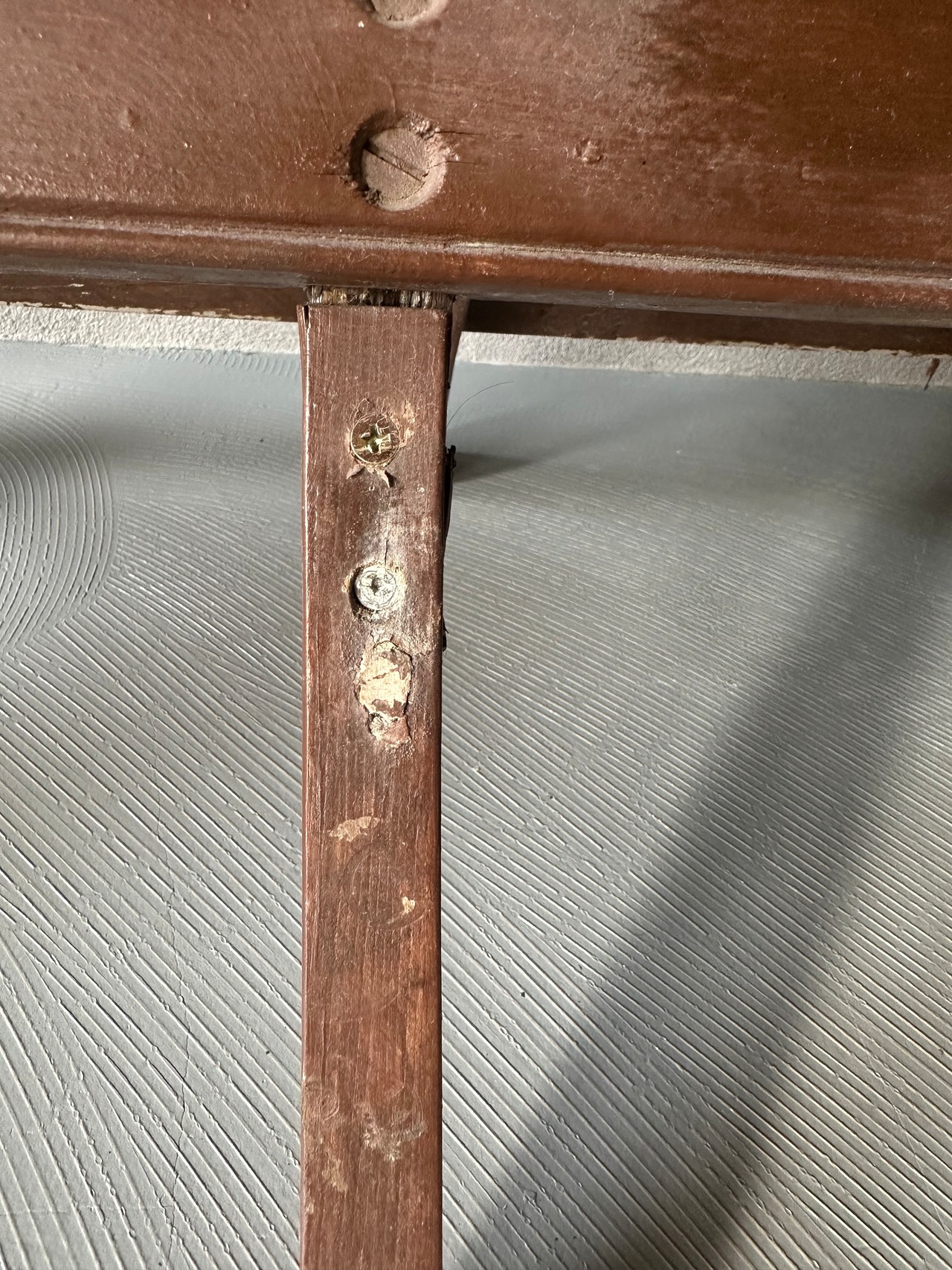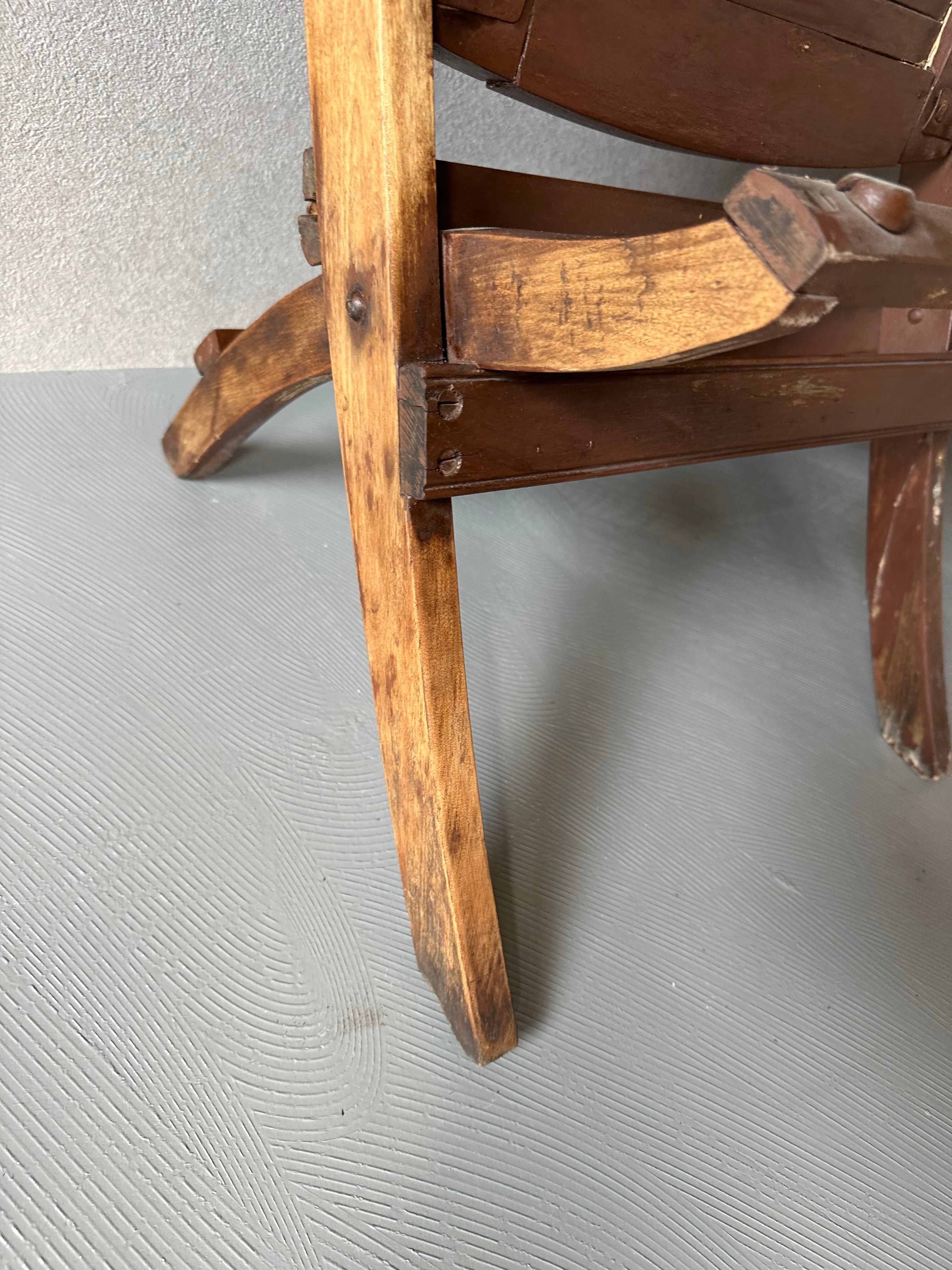 座って右から2番目の足が折れてますが、使用には問題ありませんが必要以上の力や重量物を載せると破産の恐れがあります。アンティークウッドを十分理解し写真で判断して下さい。